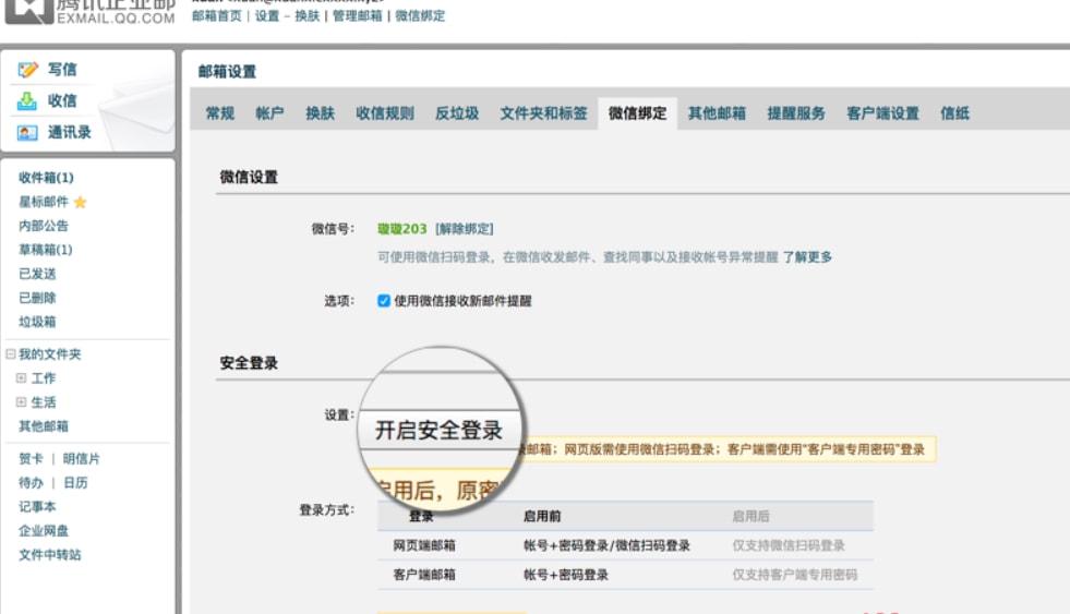 腾讯企业邮箱开启安全登录,简单来说就是把企业邮箱账号和微信绑定。启用安全登录和关闭安全登录,主要是登录方式发生了变化。