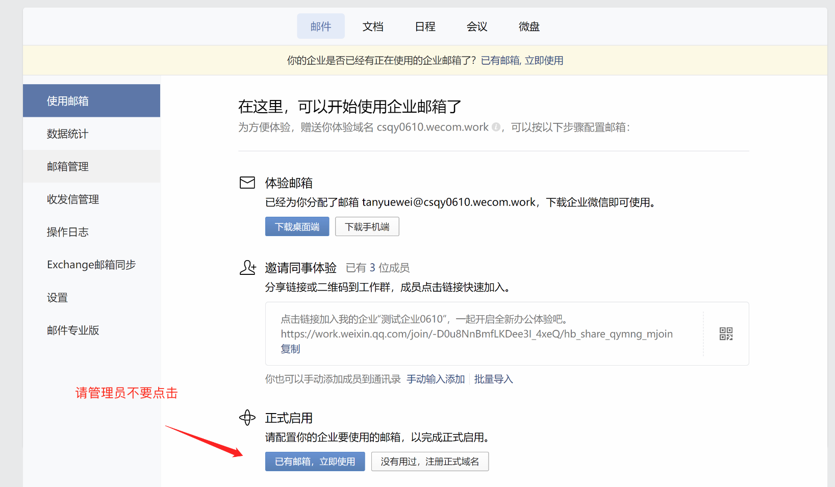 请管理员不要在以下页面,进行域名的绑定操作。这会导致原来的邮箱数据丢失。后续腾讯研发团队将会支持将企业邮箱整体迁移到企业微信,以替换体验域名。希望将邮箱和企业微信统一合并管理的企业可联系我司销售登记,后续排期升级。目前由于产品还在测试阶段,不建议升级。