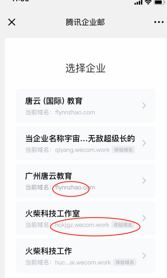 5.微信扫码登录网页版企业邮,如果有多个企业,不同的企业会对应邮箱域名显示。如果企业分别使用收费版腾讯企业邮,和企业微信,可以通过域名识别企业。