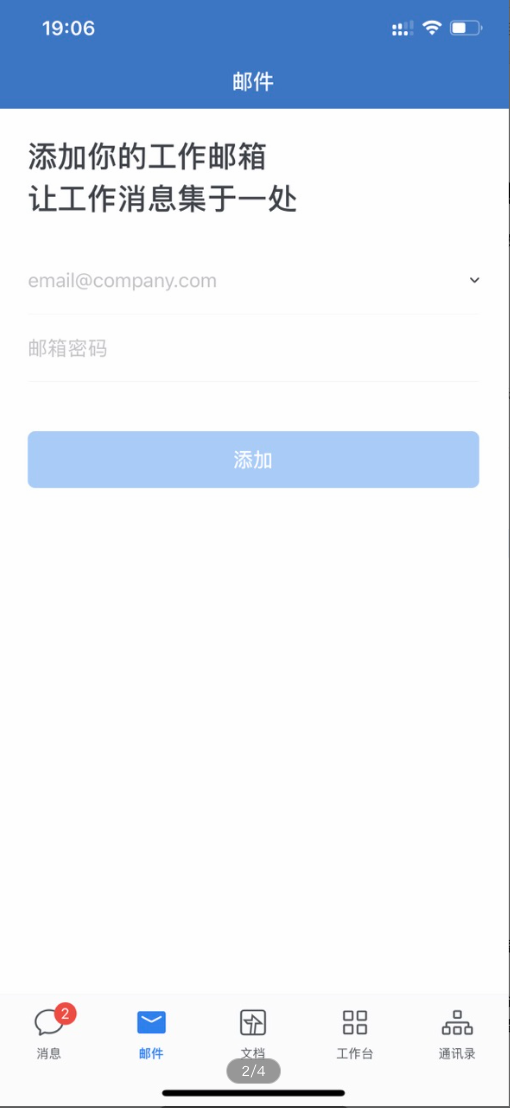 2.请注意,要实现员工在企业微信上登录已有邮箱,只需要员工在自己的企业微信客户端邮件按钮进行账号密码登录。