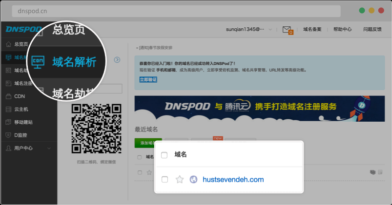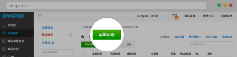 (1). 登录DNSPOD,进入【域名解析】,点击域名,或者下方提醒