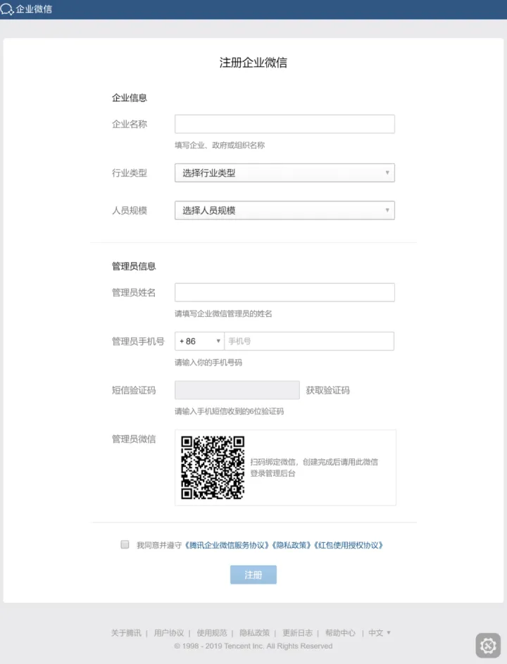 直接开通企业邮并同时开通企业微信。注册企业微信,在页面依次输入企业名称、管理员姓名、管理员手机号等,并使用管理员的微信扫码完成注册。