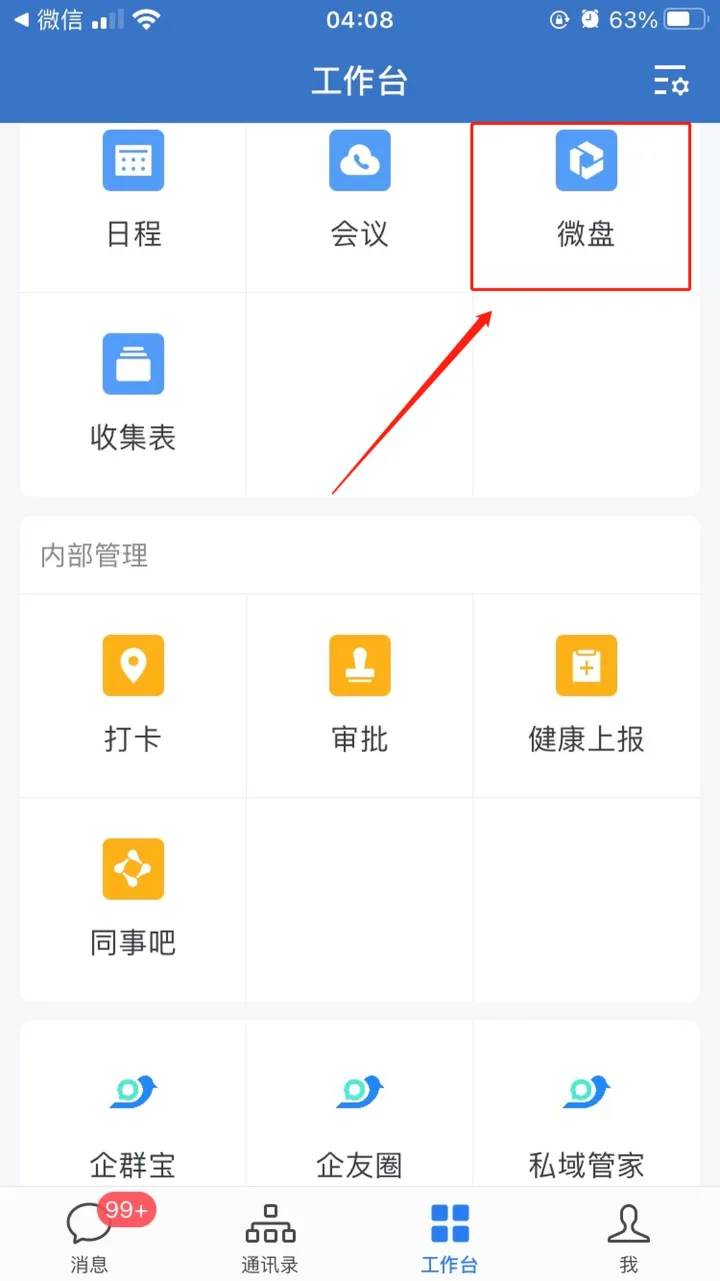 当我们使用企业微信APP时,想要打开企业微信微盘,只需点击【工作台】-【微盘】即可。