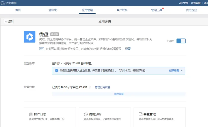 但是有朋友反映,为什么自己的微盘功能没有显示出来呢?其实是因为企业微信管理员没有开启该功能。想要开启微盘功能,管理员仅需打开企业微信后台,点击【应用管理】-【微盘】,启用微盘功能即可。