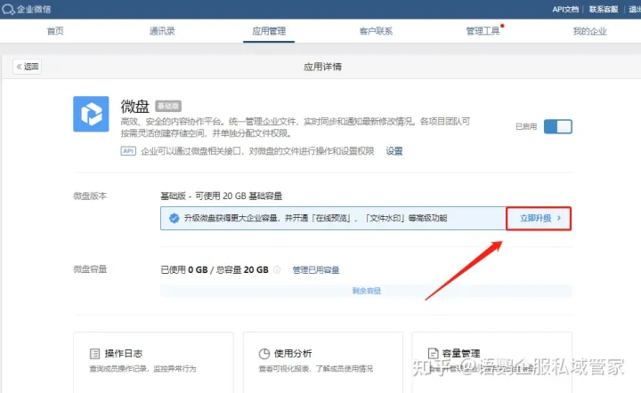 当我们需要上传的文件太大,企业微信微盘的容量不够时,可以选择扩容。管理员可以登录管理后台,点击【应用管理】-【微盘】-【购买更多容量】,根据需要购买微盘专业帐号和容量,新增的容量只有专业帐号可用。