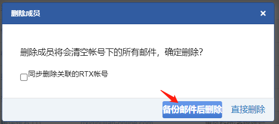 管理员后台删除成员邮箱时,可选择备份邮件后删除,保障离职成员历史邮件完整。