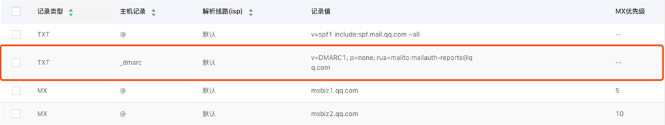 DMARC验证为TXT解析,解析前缀为_dmarc,记录值示例:v=DMARC1; p=none; rua=mailto:mailauth-reports@qq.com,其中p=none为不做任何处理,可按需更换为quarantine(投递到垃圾箱)或reject(拦截拒收)。关于DMARC详细介绍可参考以下链接: