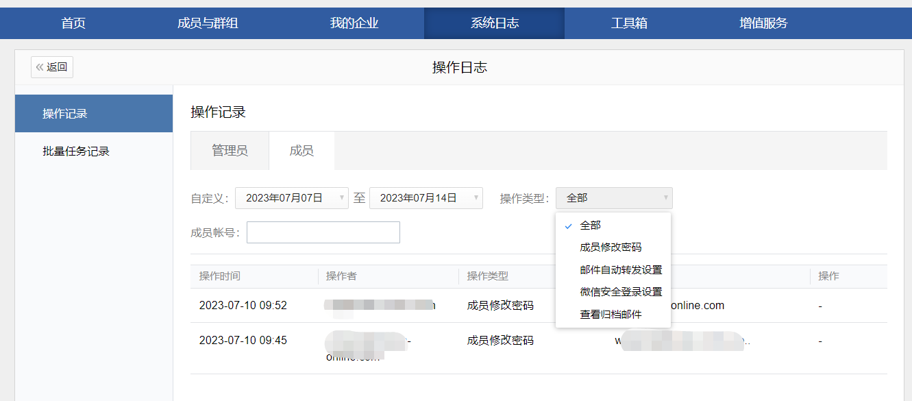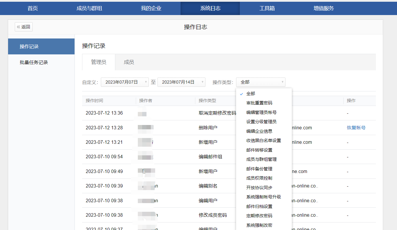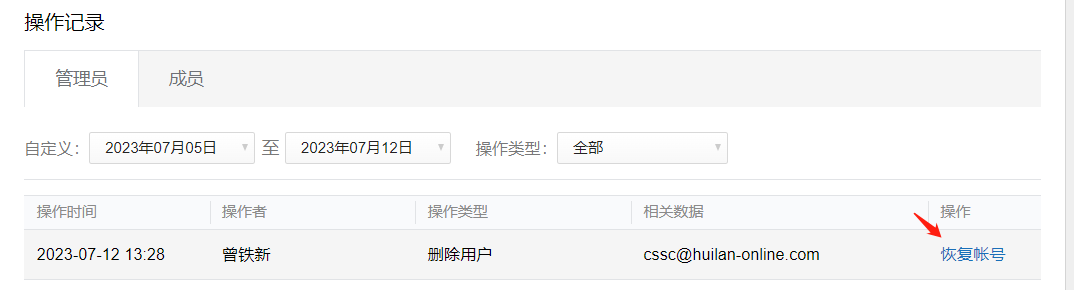 管理员删除成员邮箱10天内可以在系统日志-操作日志中进行恢复,该恢复为完全恢复,与删除前的状态和数据完全一致。操作路径:系统日志-操作日志,如下图: