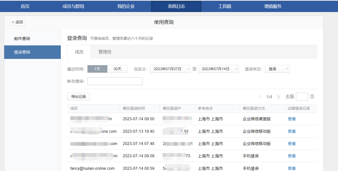 通过登录查询可以查看管理员或成员的登录详情,在盗号或疑似盗号问题发生时,通过登录查询可以确认对应时间的登录是否用户本人操作,保障帐号登录安全。操作路径:系统日志-使用查询-登录查询,如下图: