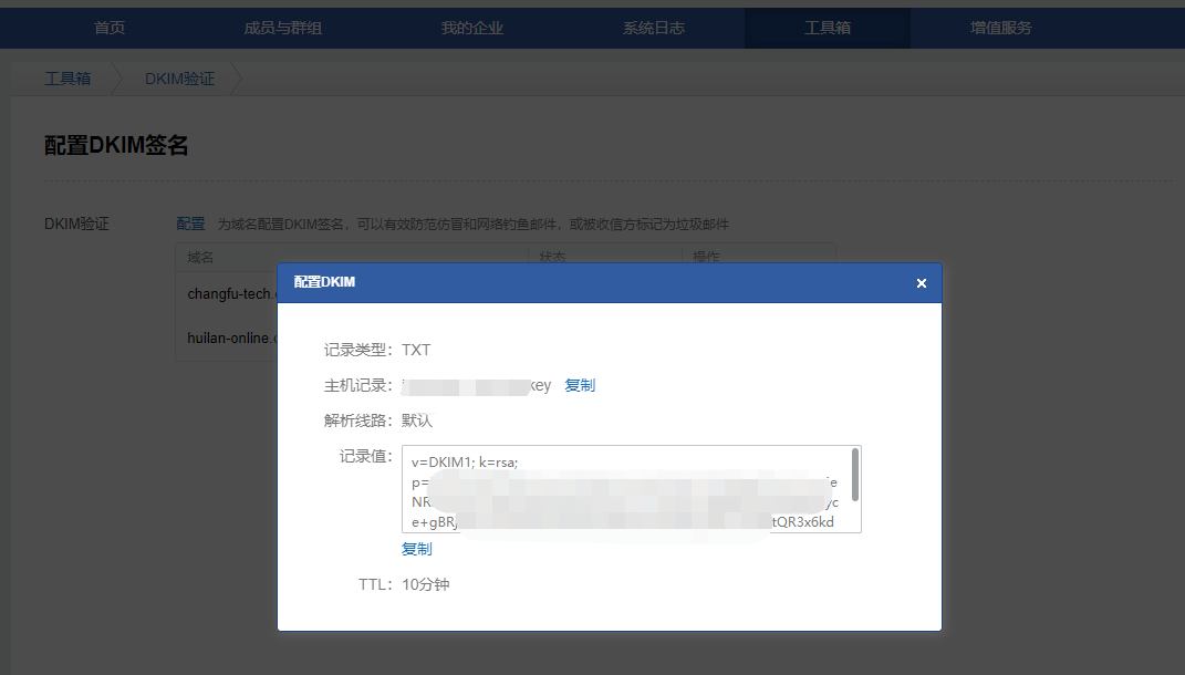 邮件发送方发送邮件时,利用本域私钥加密邮件生成DKIM签名,将DKIM签名及其相关信息插入邮件头。邮件接收方接收邮件时,通过DNS查询获得公钥,验证邮件DKIM签名的有效性。从而确认在邮件发送的过程中,防止邮件被恶意篡改,保证邮件内容的完整性。操作路径:企业邮箱管理员后台工具箱-DKIM验证。参考截图如下: