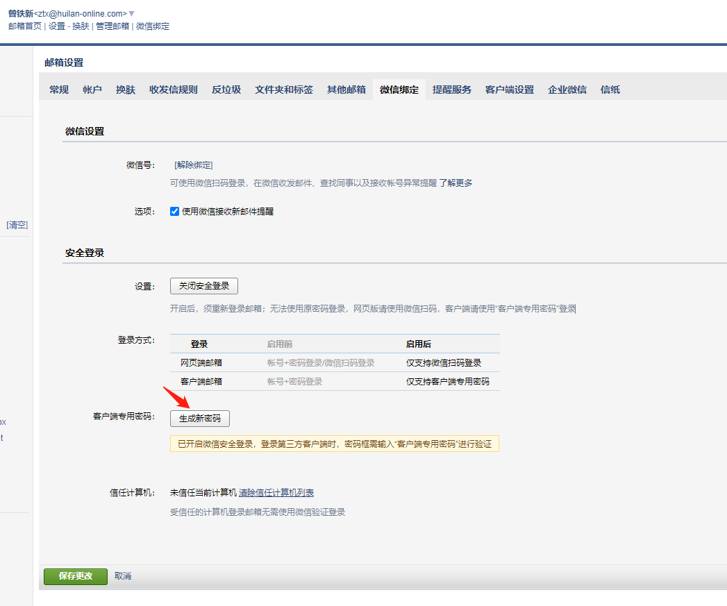 如果成员使用outlook,foxmail等客户端,需要新增客户端专用密码进行配置,如下图: