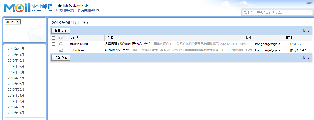 企业全员邮箱云归档,实现启用归档后的往来邮件全量长期归档,归档后的邮件在归档库中不可删除,归档管理员可以进入归档库查看邮件,进行历史邮件追溯和重投。操作路径:增值服务-邮件归档。归档库示例: