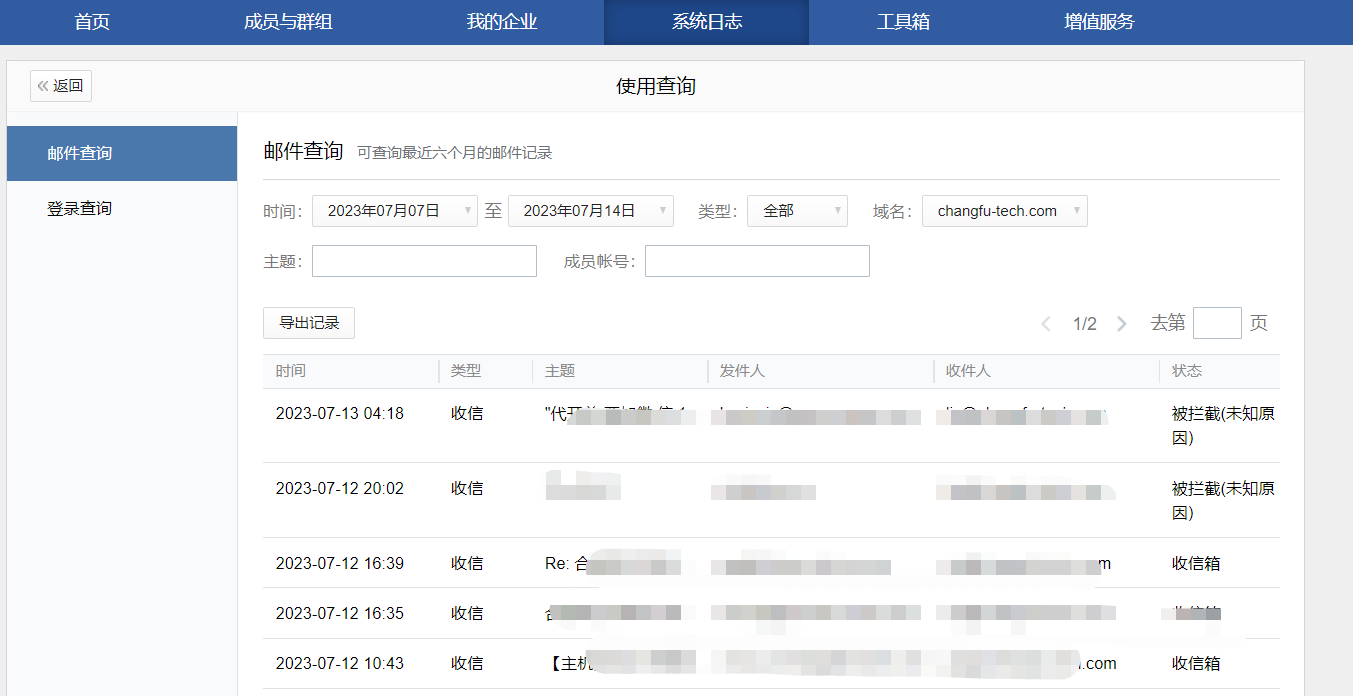 通过邮件查询,可以检索收发信的相关的记录,协助收发信类问题的定位。操作路径:系统日志-使用查询-邮件查询,如下图: