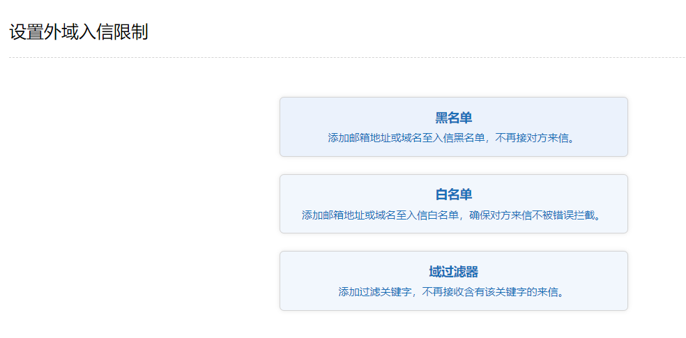 管理员后台可按需添加指定邮箱地址或域名至黑名单,白名单,实现个性化的邮件拦截与放行。同时可以设置关键词,进行邮件过滤。操作路径:工具箱-外域入信限制。