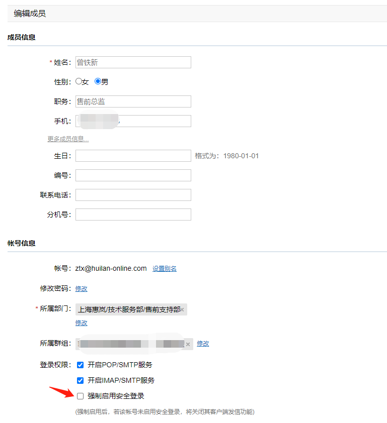 如果部分成员邮箱密码设置过于简单、经常被盗号或重要邮箱帐号需要规避登录安全风险,管理员可以在编辑成员邮箱页面中勾选“强制启用安全登录”,如下图:
