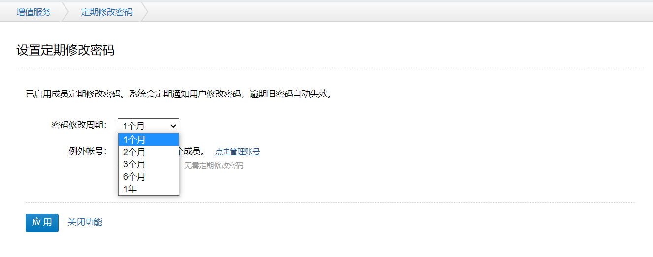 开启后系统会定期邮件通知用户修改密码,逾期旧密码自动失效,支持添加例外帐号不受影响。该功能开启后可能影响用户使用体验,建议充分评估谨慎开启。操作路径:增值服务-定期修改密码。参考截图如下:
