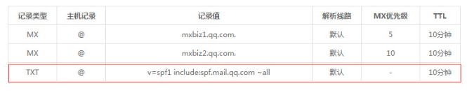 TXT记录值为:v=spf1 include:spf.mail.qq.com ~all