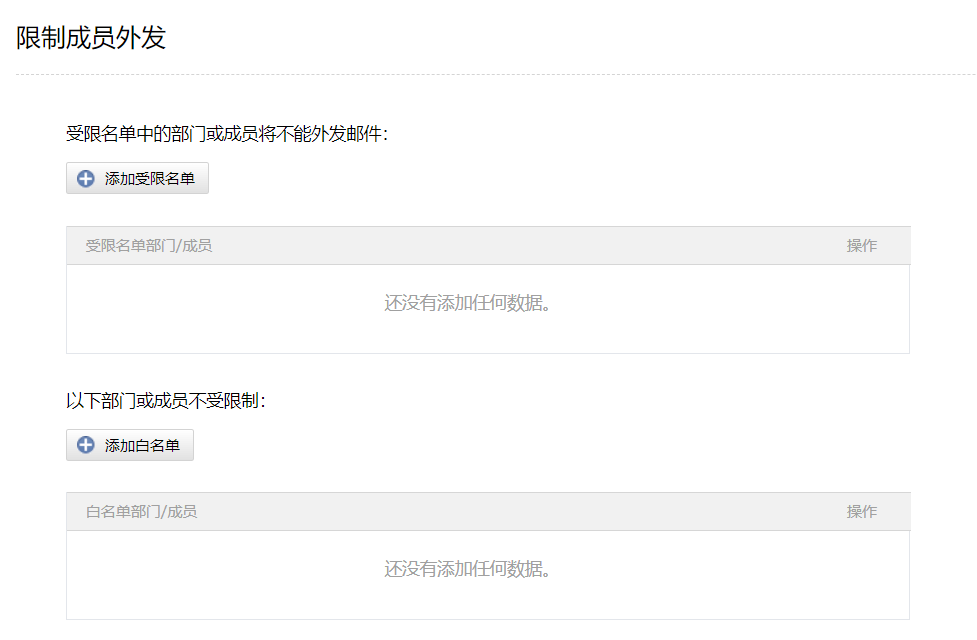 企业特定部门/成员或安全保密较高的部门/成员可设置限制外发,设置后,仅可发送内部邮件。操作路径:增值服务-限制成员外发。截图如下: