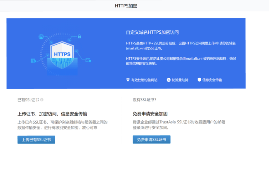为了保障传输加密安全,腾讯企业邮箱支持个性登录域名的HTTPS设置,定期年审更新SSL证书即可,支持自有证书或免费证书。操作路径:企业邮箱管理员后台增值服务-HTTPS设置。如下图: