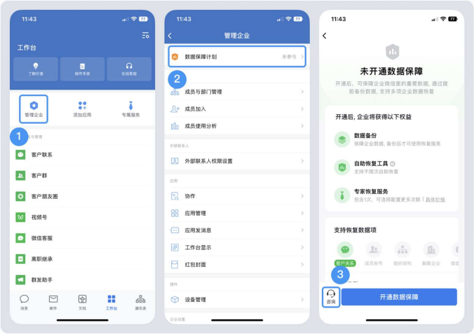 管理员点击「工作台」-「管理企业」-「数据保障计划」-「咨询」联系企微团队