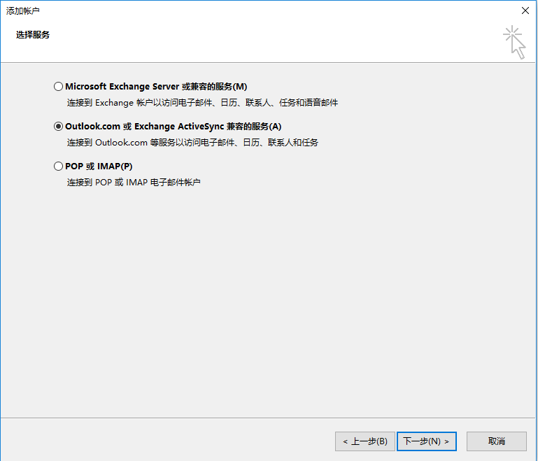 2.选择服务。选择outlook.com或Exchange ActiveSync兼容服务(A)