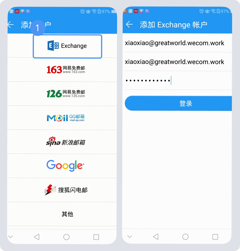 1.主菜单选择“电子邮件”跳转至“添加账户”,选择“Exchange”,输入完整电子邮件地址、用户名、密码后,点击“登录”